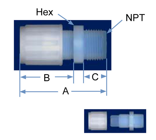 PFA Part No. | PVDF Part No. | Tube O.D. | NPT Size | Orifice | A | B | C | Hex |