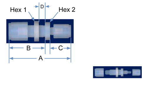 PFA Part No. | PVDF Part No. | Tube O.D. | Tube O.D. | Orifice | A | B | C |